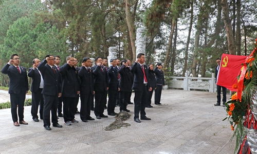 活动中,全体党员同志首先向“红军烈士墓”敬献花篮。随后,全体党员同志面对鲜红的党旗举起右拳,在李明的领誓下,重温入党誓词,表达对党的忠诚与信仰,进一步坚定共产党人的理想信念与使命担当。宣誓结束后,全体党员同志怀着无比崇敬的心情瞻仰了“红军烈士墓”和“英烈墙”,以此表达对为民族解放和国家独立献身的革命先烈最崇高的敬意。
